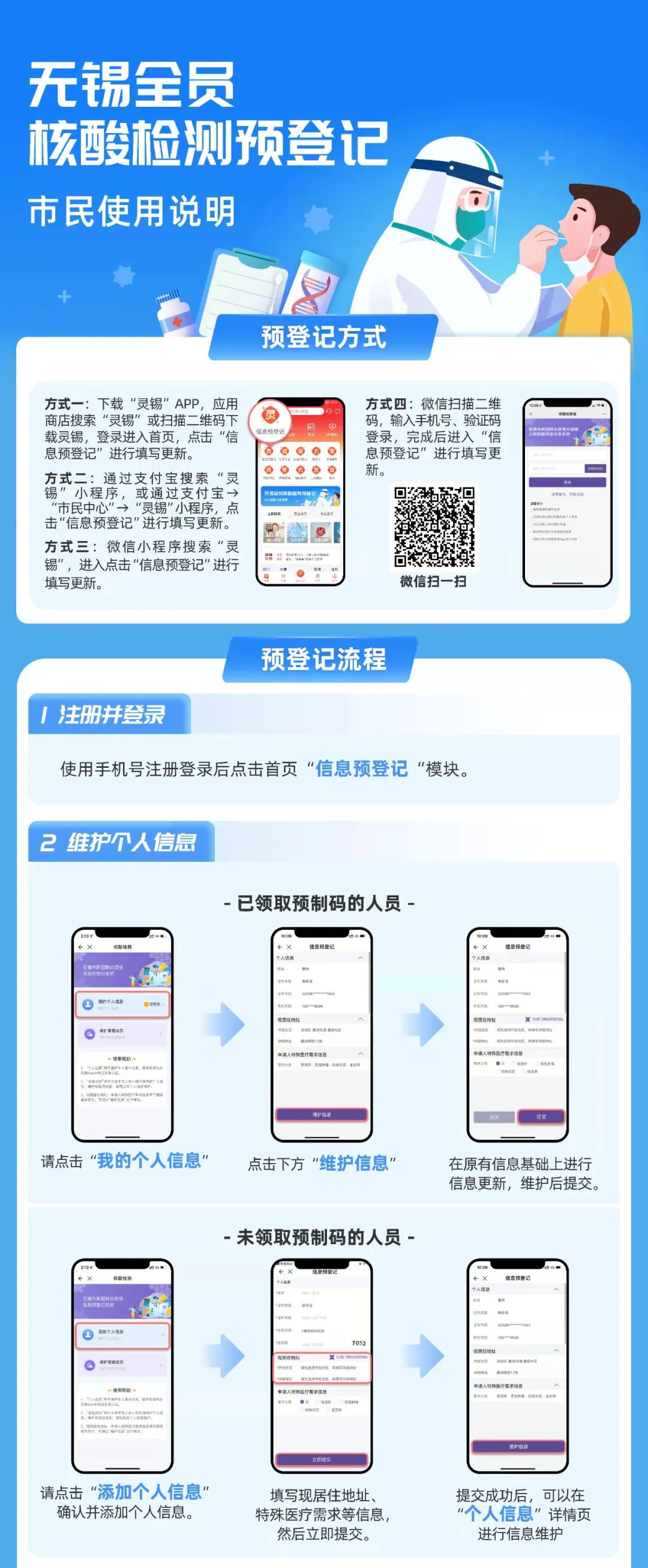 To better promote epidemic prevention and control, we’ve decided to organize mass nucleic acid test pre-registration from 26 January to 28 January. Such pre-registration helps ensure that mass nucleic acid test can be carried out orderly and efficiently if necessary, and meet residents’ needs on essential supply and special medical service under emergency. We urge all residents to timely and orderly register nucleic acid test in advance. Residents should scan the following QR code to download the app Lingxi (those who have downloaded log in) the app). Residents can also utilize Lingxi mini program in Wechat or Ali Pay. In this mini program, residents can report their identification and contact information, present living address, and special medical service needs. If the original information has any mistake, residents should update it personally. Those who have no smart phones or no knowledge about Internet can ask their family members or community workers for help.